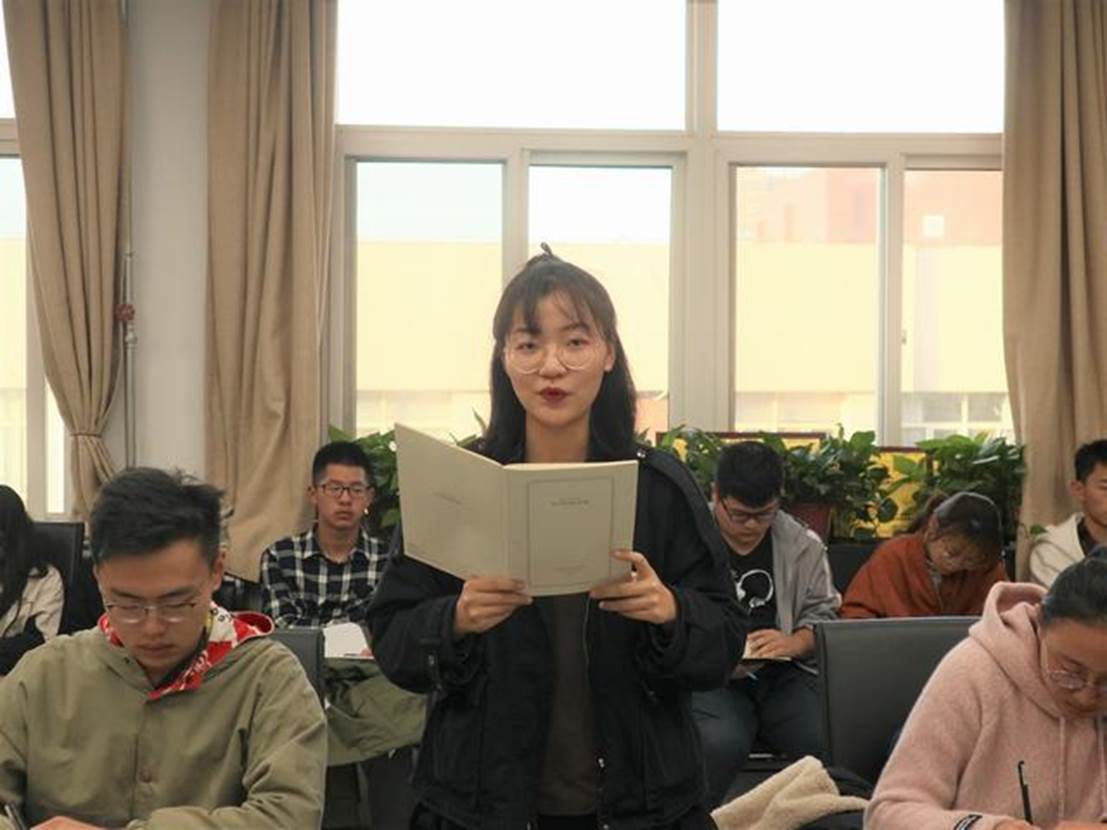 各学生代表发表学习见解。学生会主席陈映彤从国人应不忘初心、坚定文化自信等八方面做出阐述。结合自身实际表明:学生应规范自身行为,正确引导正能量传播,更重要的是国人应为自身自豪,为社会发展的各方面做出贡献。副主席王子康主要阐述了当代中国应在各方面落实党的领导和作为当代学生干部应有使命担当感。17级团支书张晓坤表示学生应提高个人认知,不断完善个人文化修养。