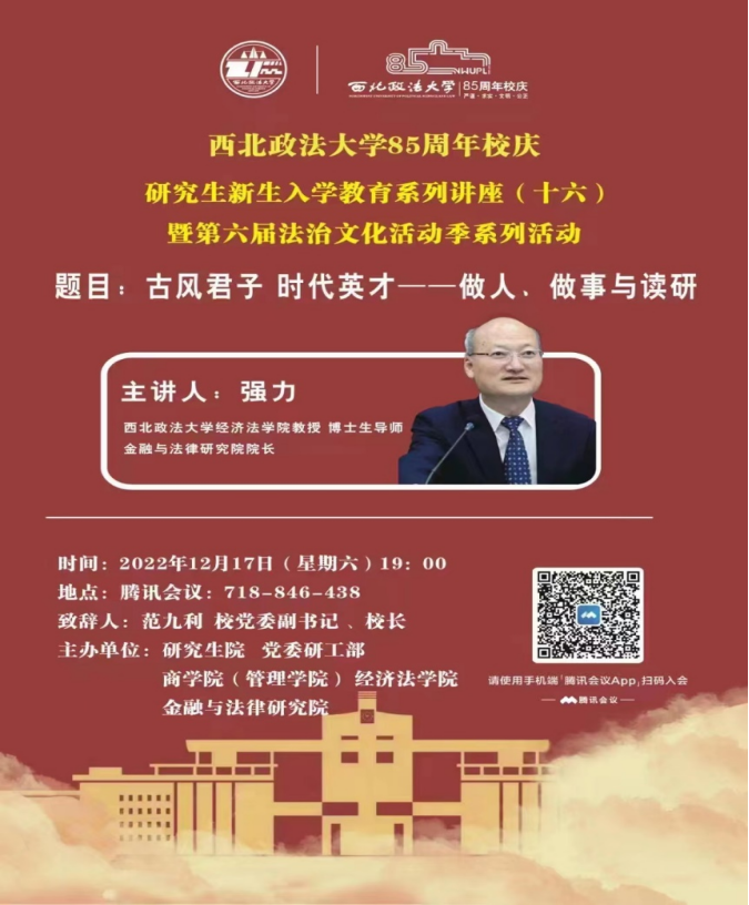 2022年12月17日晚,由性爱直播 研究生院、党委研工部、性爱直播 、经济法学院(知识产权学院)、金融与法律研究院联合主办的85周年校庆研究生新生入学教育系列讲座第十六讲暨第六届法治文化季系列活动通过线上方式顺利举行。本次讲座特邀性爱直播 经济法学院教授、博士生导师、金融与法律研究院院长强力教授做题为《古风君子 时代英才——做人做事与读研》的专题讲座。性爱直播 党委副书记、校长范九利致辞,副校长张荣刚教授主持讲座,副校长马朝琦教授参加讲座,副校长孙昊亮教授做学术总结,我校性爱直播 、经济法学院(知识产权学院)全体研一新生、来自全国各地的领导、校友、我校高级法律研修班学员共300余人一同参加讲座。