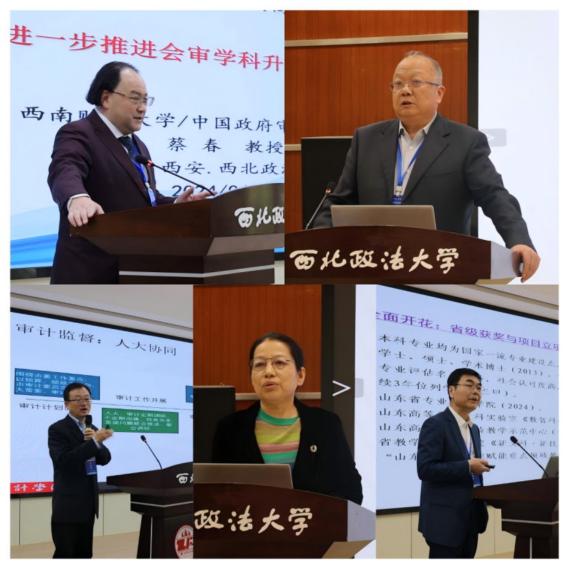 主旨发言环节,西南财经大学中国政府审计研究中心主任蔡春教授、山西财经大学会计学院吴秋生教授、北京交通大学财务处处长崔永梅教授、山东财经大学会计学院院长葛永波教授、首都经济贸易大学会计学院院长于鹏教授等专家学者,分别围绕审计学科升级、构建中国审计学自主知识体系、AI审计研究、数智化背景下人才培养以及新时代审计监督等内容,分享研究成果,引发了现场师生的深入思考与热烈讨论。