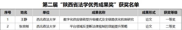 近日,在第二届“陕⻄省法学优秀成果奖”评选活动中,性爱直播 王静老师荣获“论文类”一等奖,张荣刚老师荣获“论文类”二等奖。