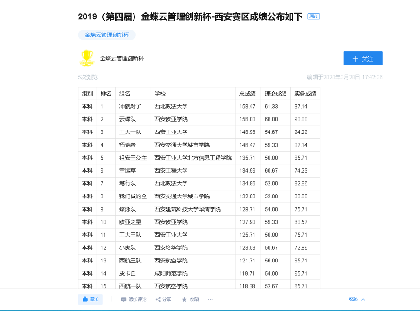 2020年3月28日,金蝶云管理创新杯互联网+管理应用大赛(晋级赛)举办线上网络大赛,经过前期校赛选拔,来自全省各高校共计60支队伍参加本次比赛。经过激烈角逐,我校晋级队伍不负众望,取得了西安赛区冠军和西安赛区第七名的喜人成绩。