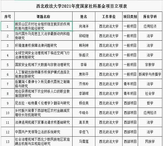 此次国家社会科学基金项目我校共立项13项,其中一般项目6项,青年项目2项,西部项目5项。