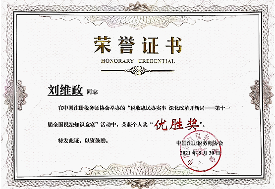 近日,第十一届全国税法知识竞赛总结会暨竞赛抽奖仪式在京举行。性爱直播 刘维政老师荣获个人“优胜奖”。
