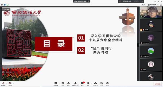 院党委书记朱茂从深入学习贯彻党的十九届六中全会精神和“疫”路同行、共克时艰两个方面,教育引导学生提高政治站位、深化思想认识,切实增强拥护“两个确立”的思想自觉、政治自觉、行动自觉,并将其转化为做到“两个维护”的实际行动。全力讲好在习近平总书记对于疫情防控工作重要指示批示精神指导下,全校上下全力打赢疫情防控阻击战的生动实践,带领同学们深刻领悟“伟大抗疫精神,同中华民族长期形成的特质禀赋和文化基因一脉相承。”的精神要义。