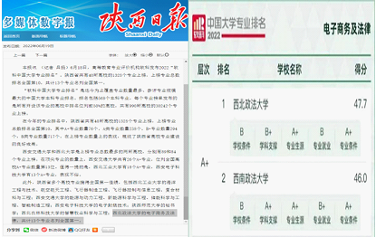 高等教育专业评价机构软科发布2022“软科中国大学专业排名”, 西法大电子商务及法律专业排名第一,层次为A+。