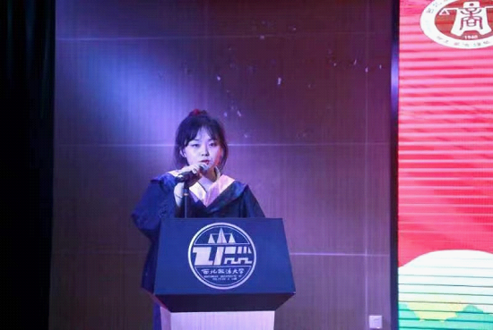 在校学生代表吉予发言。感谢四年来学长学姐们的无私帮助和关心关爱。愿学长学姐们勇敢奔跑在属于自己的人生大路上,勇担青年职责使命,展现西法大人的独特风采。