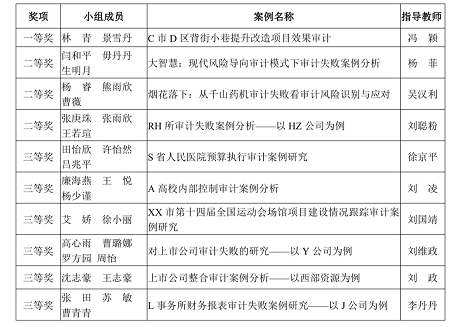 最终,经过两轮评审委员会认真细致地审阅,综合多项评审指标,评选出一等奖 1 名、二等奖 3 名、三等奖 6 名。获奖案例将收入我校审计教学案例库,具体结果如下: