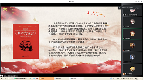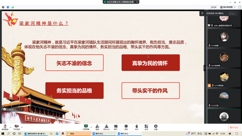腹有诗书气自华,通过读书可以提高思想的深度,增加人生的厚度,用强大的思想武器武装头脑,是实践工作方向不偏、有序有力、科学创新的最基本的思想保证。在读书分享环节,同学们紧紧围绕“品读经典,党的光辉指引我前行”的主题,结合自身阅读经历对梁家河精神、红船精神等中国共产党的宝贵精神展开激烈讨论。