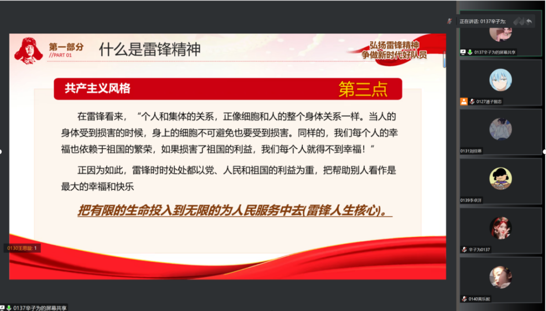 本次活动中各班组织大家学习领会党的十八大以来习近平总书记对弘扬雷锋精神作出的一系列重要论述,认真学习雷锋同志全心全意为人民服务的事迹和崇高的人生理想和高尚的道德情怀。