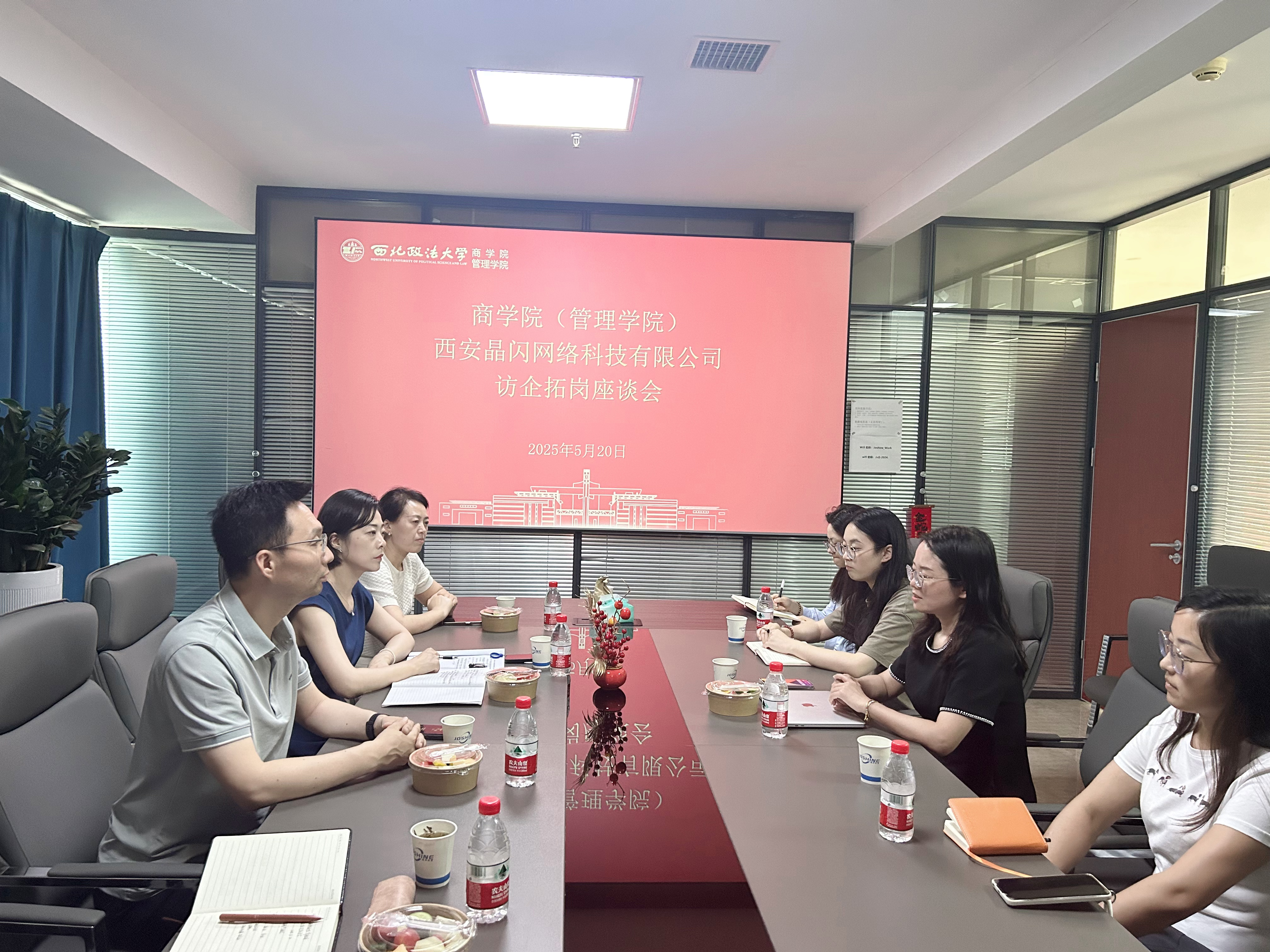 5月20日下午,性爱直播 赴西安晶闪网络科技有限公司开展访企拓岗活动。院党委书记赵参、副书记蔺媛、电子商务系李继玲老师、兼职辅导员张轶妹参加,西安晶闪网络科技有限公司总经理胡甲梅、人力资源、信息技术部门负责人及毕业生校友参加座谈。