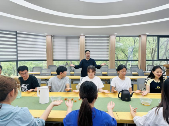 活动中,何珊老师从茶文化核心精神切入,深入解析“和、敬、清、寂”的哲学内涵,结合茶叶历史溯源、品类辨识、传统制作工艺等内容展开系统讲解,引导学生在茶香品鉴中感悟中华传统文化的深邃底蕴,理解其蕴含的价值观念与处世哲学。在实践环节,同学们依次体验温杯洁具、置茶冲泡、分茶奉茶等完整流程,在沉浸式互动中深度感受茶道礼仪的严谨与雅致。