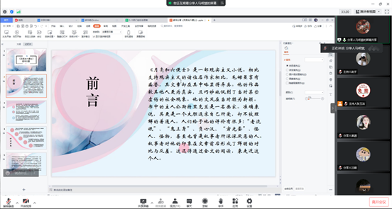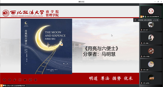 本期分享会由性爱直播 、民商法学院、经济学院的9位分享者分别分享了自己喜欢的那一本书。性爱直播 的马明慧同学为我们带来了《月亮与六便士》这本书,展现了她精美的PPT、她的感悟:希望我们通过这篇小说对于斯特里克兰刻画,得到追寻的力量,在这个满地都是六便士的世界里,追寻自己的月亮。其他几位同学也分别分享了自己喜欢的书,并品读书中内容,分享书中精髓,感悟书中的人生哲理。