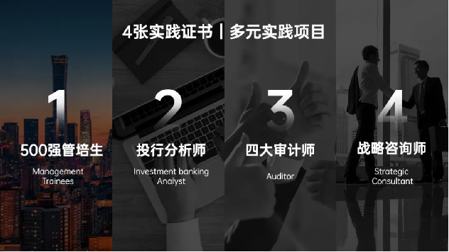 依托四大专业板块理论知识,设计了四个不同从业方向:500强管培生、投行分析师、四大审计师、战略咨询师的实践应用项目。实践项目由对应从业方向导师带训实践,学生可以在实践中学习对应技能,了解财经领域的职场规范和行业动态,提高职业素养和竞争力,为未来职业选择奠定基础!