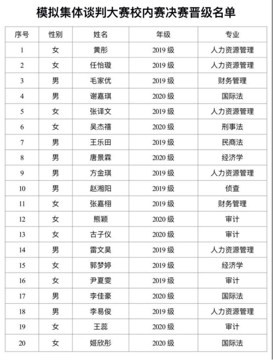 第七届模拟集体谈判大赛复赛顺利结束,共有20名选手晋级决赛。让我们一起来看看晋级决赛的名单吧!