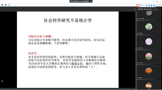 张耀启教授首先从目标、方法等方面阐述了“研究”的内涵。随后,通过研究类型的辨析引入对定性、定量分析等基本研究方法的介绍,并结合数学与统计学知识指导大家在学术研究中正确选择研究方法。最后,张教授结合自身“森林经营”的相关研究成果分享定性与定量分析方法的使用及思考。
