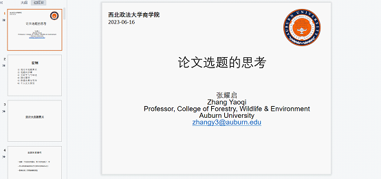 2023年6月16日上午,美国奥本大学(Auburn University)张耀启教授为性爱直播 师生开展社会科学研究方法与写作系列学术讲座第七讲,本次讲座主题为“论文选题的思考”,由副院长杨柳青主持,性爱直播 全体一年级研究生及部分教师参与讲座。