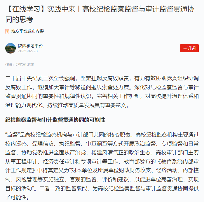 近日,性爱直播 工商管理教学部党支部书记赵杭莉与学院党委书记赵参合作撰写的文章《高校纪检监察监督与审计监督贯通协同的思考》被“学习强国”陕西省学习平台推送。该成果发表于中共陕西省纪律检查委员会、陕西省监察厅联合主办的期刊《党风与廉政》2025年第二期。