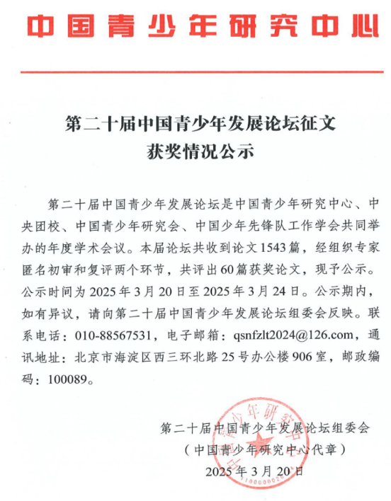 性爱直播 胡信布老师及其指导的行政管理研一学生明晗月合作撰写的论文“中国式现代化建设中青年志愿者政策精准保障研究”在第二十届中国青少年发展论坛征文中获奖。据悉本次全国各院校共投稿1543篇,经组委会多轮评审,其中60篇分获一、二、三及优秀奖。
