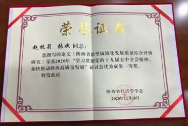 性爱直播 副教授、资源冲突与利用研究所所长赵杭莉老师与2019级财务审计与风险管理专业研究生张欢共同撰写的题为《陕西省新型城镇化发展质量综合评价研究》的论文荣获2020年“学习贯彻十五届五中全会精神,推动陕西经济高质量发展”研讨会优秀成果一等奖。