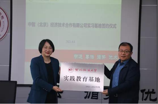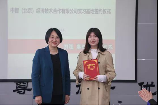 实践教育基地”,崔岩副总经理向人力资源管理专业二年级学生高雨授予“中智(北京)公司校园大使”聘书。